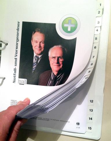 So gibt es neben der Bezeichnung Not-Fallordner, Notfall-Ordner, Dokumentenordner, Dokumenten-Ordner, Notfallplan auch die Bezeichnung Vor-Sorgeordner, Vorsorge-Ordner, Vorsorgeordner, oder: